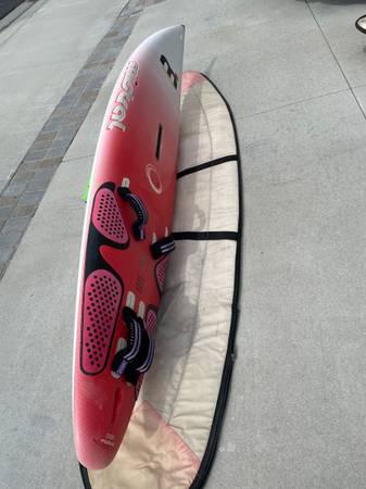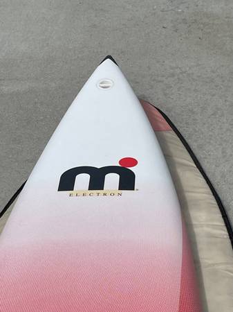Mistral Electron windsurf board in excellent condition with North Sail padded bag. No dents, or cracks. It comes with adjustable foot straps and one fin. Class carbon sandwich construction.