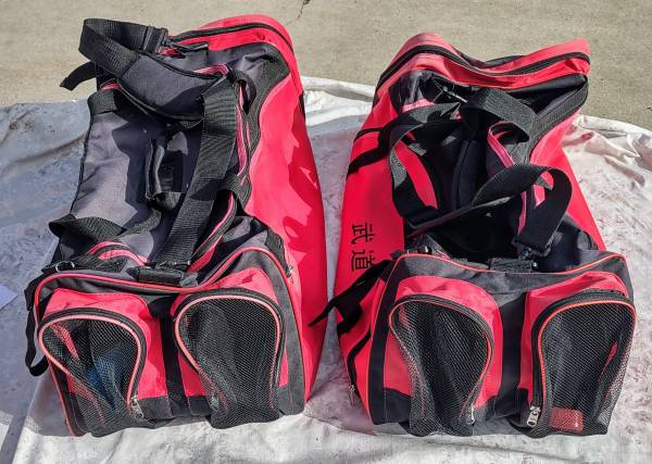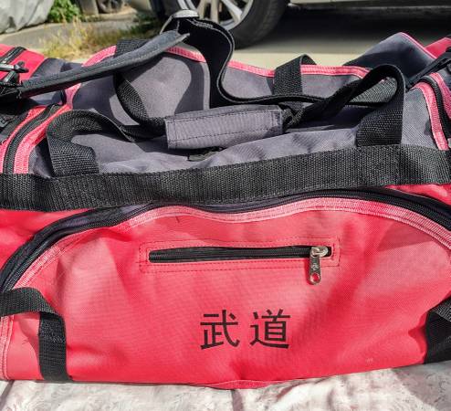 Masterline nylon bag. Three zippered compartments on either side; with another on one end, and two others made with mesh on the opposite end. "Martial Arts" in Chinese characters (Kanji), printed on one side. Size: 13”x27”x14”