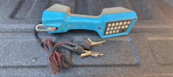 test set / blue / used stored in garage / will need batteries + alligator clips/cord to be replaced.