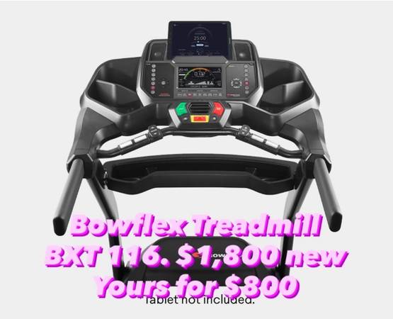 Bowflex BXT 116 Paid $1,800. Asking: $800 - Incline range 0% - 15% - 3 ply treadmill belt - 375# weight capacity - Easily folded deck