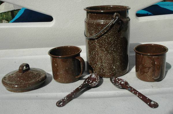 Vintage Brown Enamel Coffee/Tea Camping Kit. Holds about 8 Cups The Spoons are not Original to Set. Pot is 10" Tall Mugs About 3.5"