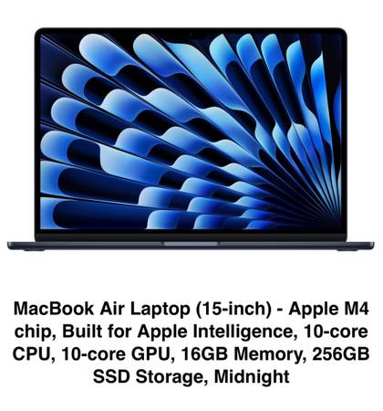 MacBook Air Laptop (15-inch) M4 chip, 16GB Memory, 256GB SSD Storage Midnight, Warranty, BRAND NEW