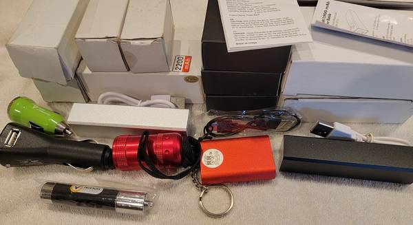 Cell Phone Backup Chargers, Car Lighter Adapters, and Mini Flashlights – ONLY $5.00 each OBO (Various prices on Amazon) 5 – Red, black, and white cell phone back up chargers 3 – Mini Flashlights 2 –...