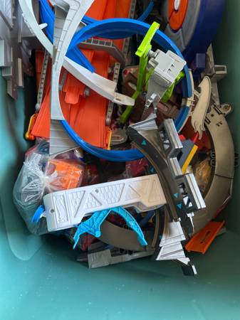 Hot Wheels tracks and accessories. Only used a few times. I bought it at a high price from different stores. It is a good collection to add to your children's toy room. The price total value of around $200 but is being sold for $60 only. The Hot Wheels tracks and accessories have been cleaned and kept inside the storage box.