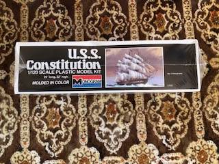 Monogram vintage 1979 USS Constitution 1/120 scale plastic model kit. Sealed box never opened. Molded in color. Detailed decks, hull, deck structures, fittings, masts, rigging includes pre-formed sails, rigging thread, display stand. It is 29" long and 22" high when assembled. MADE IN USA!