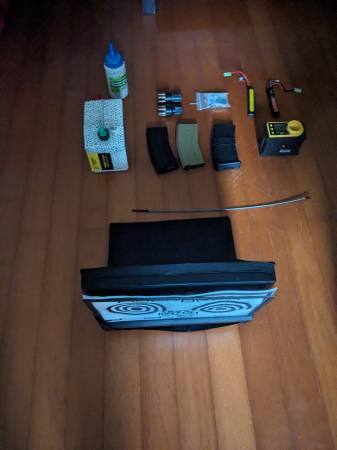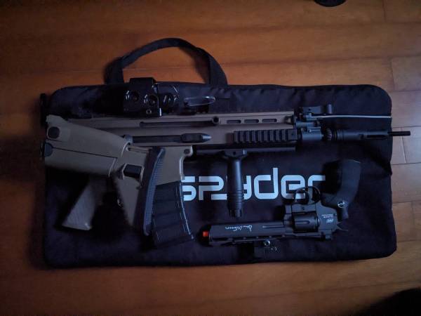 Cybergun Scar L and Smith & Wesson revolver. Scar L comes with holographic sight, sight shield, fore grip, flash light/ lazer, upgraded hop up and barrel, 3 magazines, 2 LiPo batteries and battery voltage regulators. Revolver comes with red dot sight, two speed loaders and 12 reusable bullets. Also including carrier bag, test target practice, over 10,000 BBS, FPS reader, and extra parts and maintenance items. Do not have battery charger included