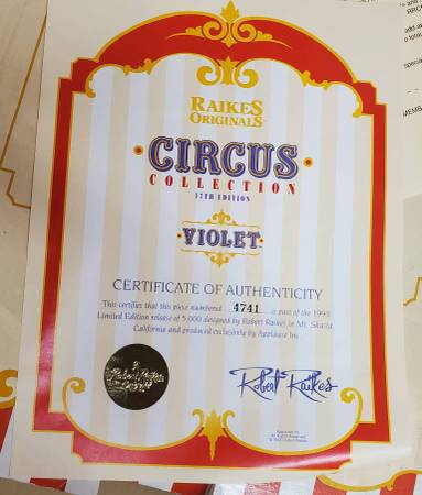 This listing is for an adorable 1993 Robert Raikes Circus Collection Violet Pig doll/plush with the signature Raikes wooden face and feet. This item is limited edition of 5000. Violet is part of the...