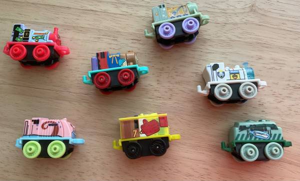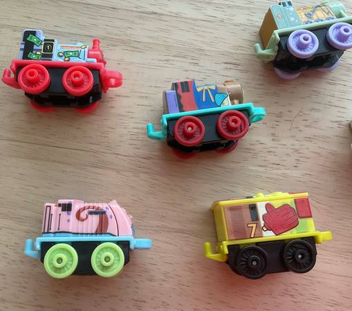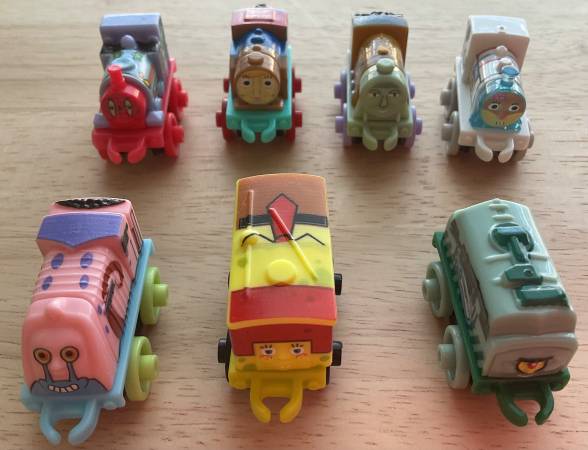(7) SpongeBob themed Thomas & Friends minis trains. Good condition. Please note. There are other similar minis trains in a (9) pack but the two crossed off you see in the last pic will not be included in this sale. Only Using that pic as reference so you can see the minis “trains names” you will receive in this ad. If you see this ad, it’s still available.