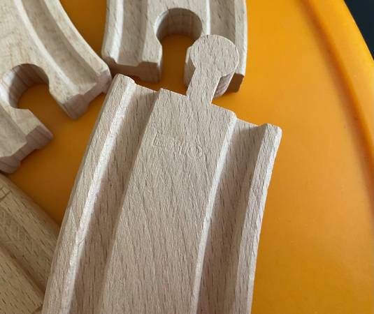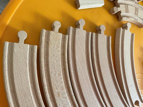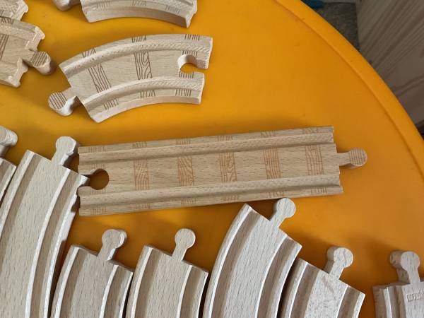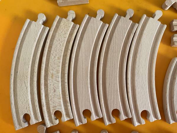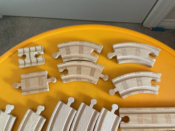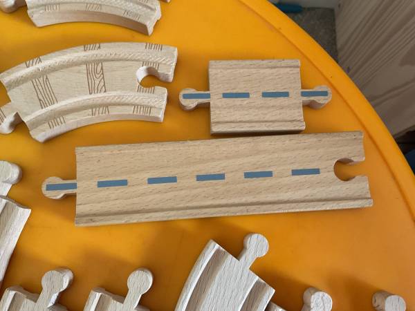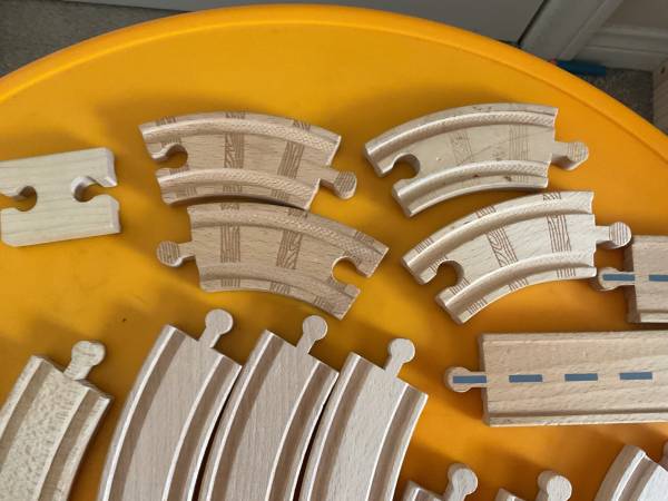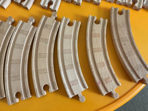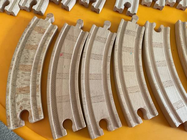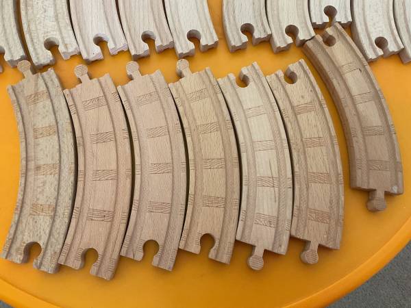 Up for sale, 24 pieces of wooden track. 5 stamped Brio are 6.5” tracks. There are also 5 stamped Brio 4” tracks. The rest of the tracks are Thomas & Friends wooden railway various sizes. There are two types of Thomas track; lined like a road and regular. The Brio track has been wrapped in bubble wrap and was not really played with. There are some marks on the other tracks from normal play.