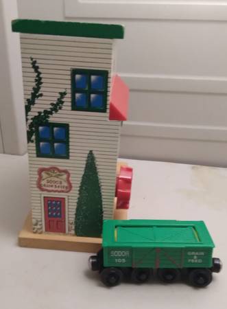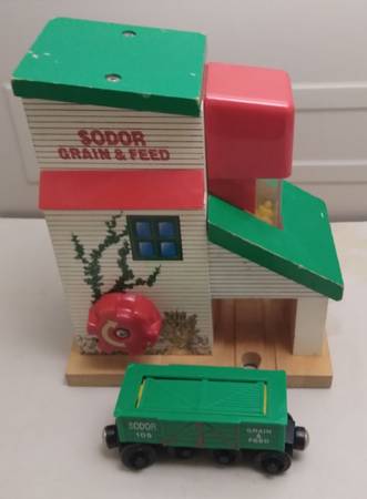 Thomas wood building with car. Works great the Grain car automatically fills when you pull through the Grain& Feed Building. (Other Thomas and Friends items available upon request)