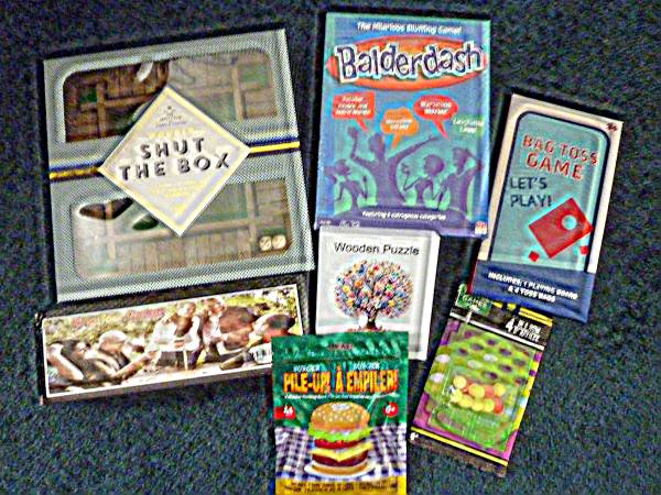 Giant selection of brand new games, offered at various prices. Included are: CONNECT 4 - $5 PICTIONARY AIR - $5 2 PHASE 10 - $4 EACH GIANT CARDS - $4 MANCALA - $10 DART BOARD WITH STICKY BALLS - $8...
