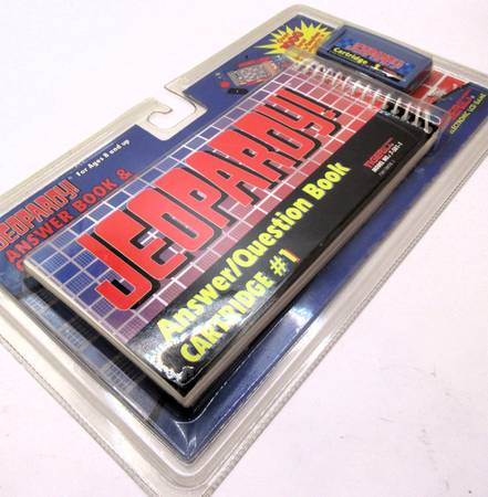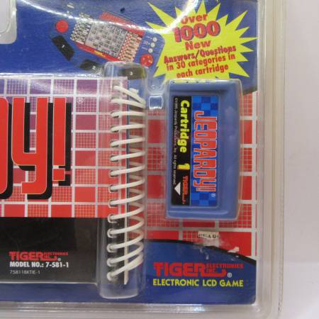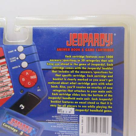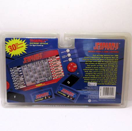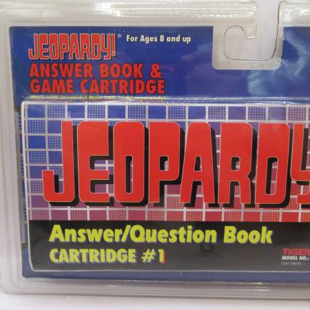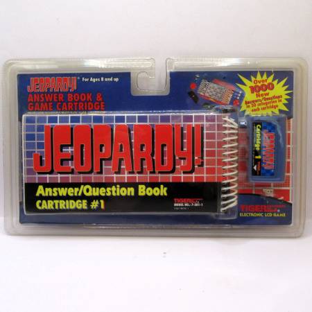 New and sealed "Jeopardy! Answer Book & Game Cartridge #1" for the Tiger Electronic LCD Game, designed for ages 8 and up. This 1995 edition includes an answer/question book and a game cartridge, featuring over 1000 new answers and questions across 30 categories. It is compatible with the Tiger Jeopardy handheld electronic game console.