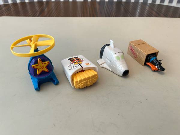 Selling as 1 lot. Exploding French fry car with Mr. Potato Head inside. Dog: shoots out of crate when lever pushed. Rocket ship: separates when button pushed. Helicopter: rotor blade flies off when...
