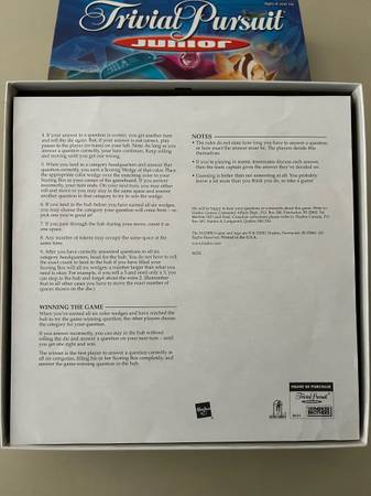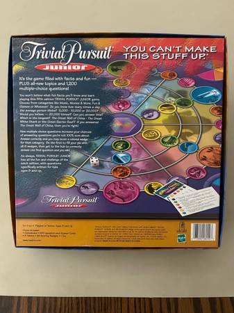 For 2 to 4 players or teams, ages 8 and up. Includes: game board, 200 questions and answers, 4 tokens, 24 scoring wedges and 1 die.