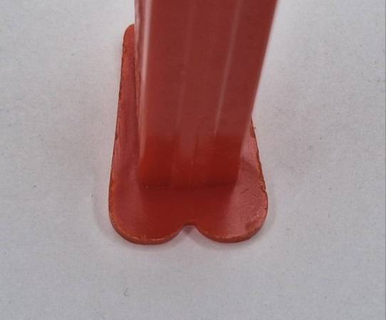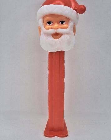 Manufactured in Slovenia, this 1980 Santa Claus PEZ dispenser is characterized by its red Santa hat with a white brim and pom-pom, a white beard, and open eyes. The dispenser features a red stem and a footed base, indicating it is an earlier model before the footless designs became prevalent. This type of dispenser is a collectible item, particularly sought after by PEZ enthusiasts and collectors of Christmas-themed memorabilia.