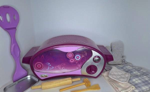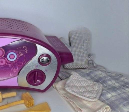 LEARN HOW TO BAKE: This retired purple Hasbro Easy•Bake Ultimate Oven bundle comes with an oven, pan, pan tool, wooden kitchen utensils, a plaid apron, oven mitt, quilted pot holder, matching dish towel, and instructions.