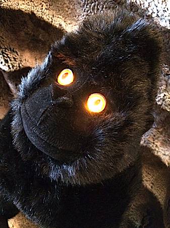 This cute fella is absolutely the sweetest toy as he uses batteries and when foot is pressed his eyes light up and there are jungle noises as well as the sounds that a gorilla would make in the wild.