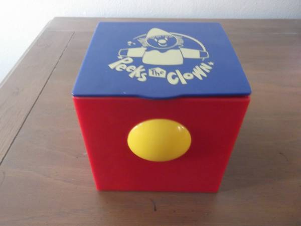 This is the Discovery Toys classic Jack-In-The-Box of PEEKS THE CLOWN. His bright red and blue box is 4" square. A vintage classic toy from 1993. Push the large yellow button on the front of his box...