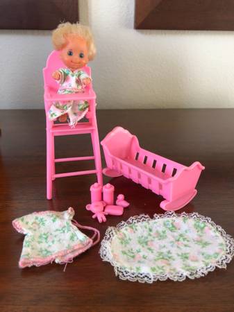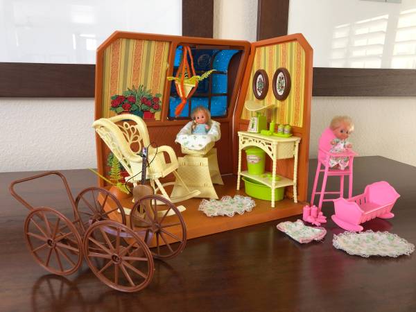 1976 baby's room or nursery by Mattel plus (2x) 1973 Baby Sweets 3" dolls and extras. These are "barbie" size play sets. Great for someone who collects Retro toys? Clean and odor free. Small break...