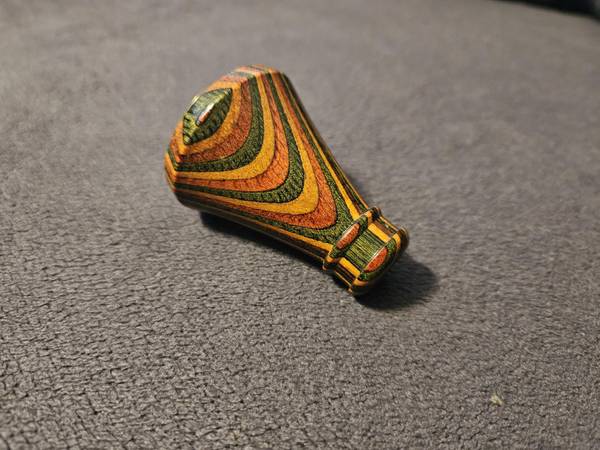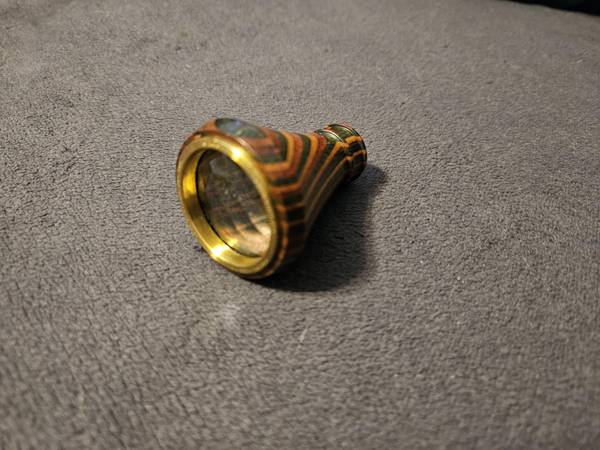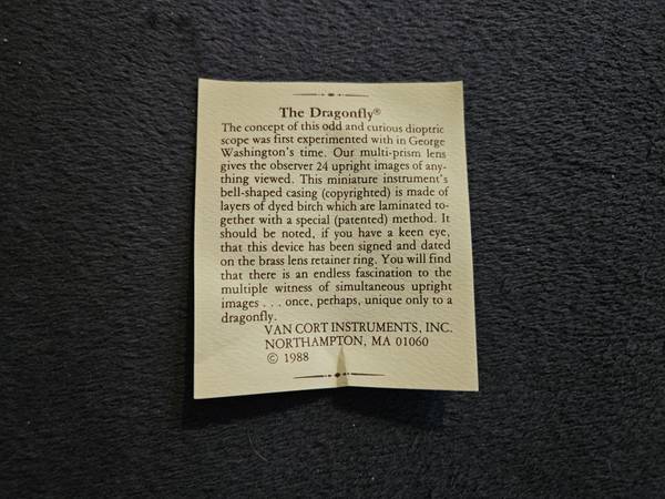The concept of this odd and curious dioptric scope was first experimented with in George Washington's time. Our multi-prism lens gives the observer 24 upright images of anything viewed. This miniature instrument's bell-shaped casing (copyrighted) is made of layers of dyed birch which are laminated together with a special (patented) method. It should be noted, if you have a keen eye, that this device has been signed and dated on the brass lens retainer ring. You will find that there is an endless fascination to the multiple witness of simultaneous upright images . . . once, perhaps, unique only to a dragonfly.
