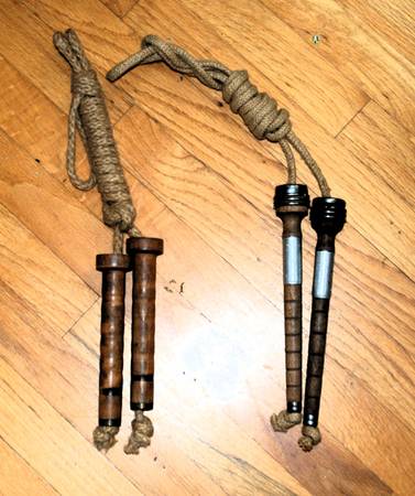 2 Antique Wooden Weaving Spindles repurposed into jump ropes - toys...