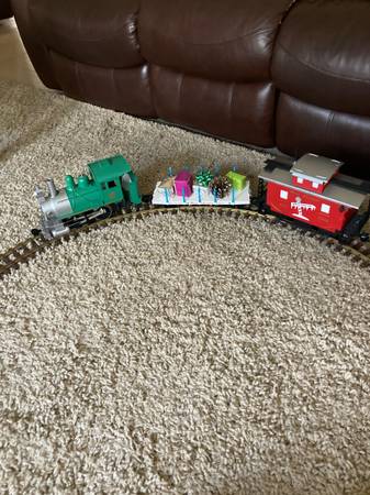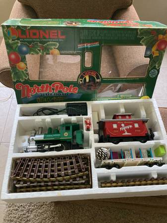 Lionel “North Pole”train set, G scale, with locomotive, flat bed car and caboose, transformer and connecting wires, 12 curved track, 2 straight track pieces