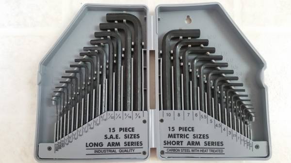 - 30 Piece Long Arm and Short Arm L key L-Keys Set. 15 S.A.E. Standard Sizes and 15 Metric millimeter sizes. $30