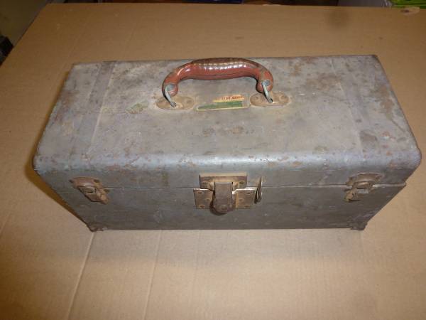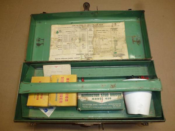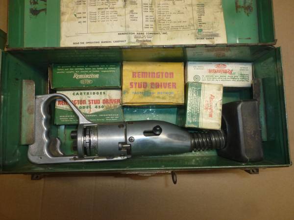 Old ram set tool for driving nails into hard material. Boxes of supplies included. See photos