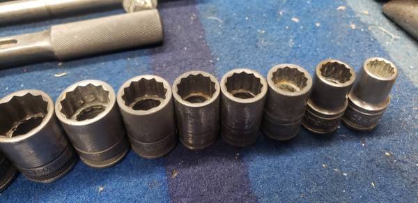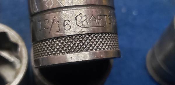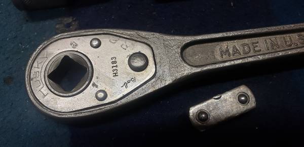 Comes with 7/16" to 1 1/8" size sockets (finish/surface is worn on some of them) that are all the underline logo (aside from double line for the 7/16, 1/2, 5/8, and 3/4), underline logo 9" sliding T bar, underline logo 2 1/2" extension, double line logo 10" extension and non reversible ratchet with drive spud is non matching and is the correct era and works perfect but is a Husky marked (not a Craftsman)