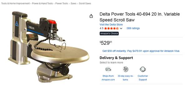 Offered for sale, an Industrial Quality Delta Scroll Saw, on a sturdy stand and ready for use. This saw has seen light duty as part of the Huntington Landmark Toymakers group, but is currently in excess of need. As with all tools in the shop, maintenance has been on a strict schedule... there is no deferred maintenance. Available new at, for example, Lowes for $529 (without the stand), this Delta Saw is fairly priced at $195. Check in with Richard at show contact info