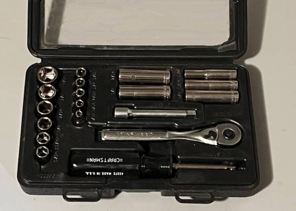 Craftsman 1/4-in, Drive 6pt. 20pc Socket Wrench Set. Made in USA. 1 1/4 Ratchet 1 1/4 Nut driver 1 1/4 extension 11 1/4 6 pt Sockets 5/32, 3/16, 7/32, 1/4, 9/32, 5/16, 11/32, 3/8, 7/16, 1/2 5 1/4 6...