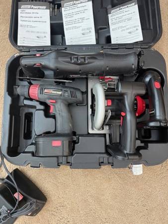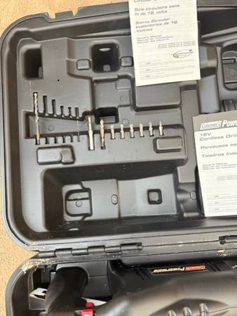 Coleman Powermate Set in storage case - Lightly used $100 OBO 1) 18 V Cordless Circular Saw 2) 18 V Cordless Swivel Head Work light 3)18 V Cordless Drill 4) 18 V Cordless reciprocating saw 5)...