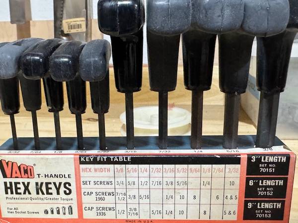 Vaco T-Handle Hex Keys. 10 pieces. Sizes 3/32, 7/64, 1/8, 9/64, 5/32, 3/16, 7/32, 1/4, 5/16, 3/8. Rarely used. Handles on some look dirty, but they clean off to shiny finish easily. $30 Email or...
