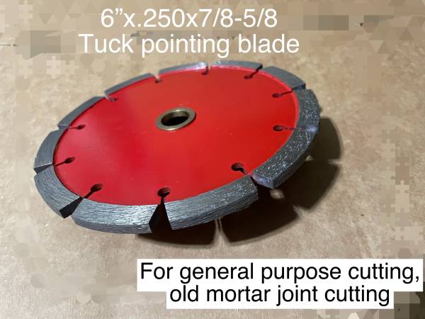 6"x.187x7/8 tuck pointing saw blade for cutting old mortar joint and concrete and general purpose(Wet/dry cutting) Price: $15/pc 6"x.250x7/8 tuck pointing saw blade for cutting old mortar joint and...