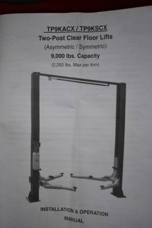 Here is a like-new item that I've only used a few times since I bought it new. I have lost my lease, so it must be sold! It's a Tuxed TP9KACX-9,000 lbs capacity Asymmetric Clear Floor 2 Post Car Lift-220 Volt. Rubber Door Guards, Chain Drive Cylinders, Dual Point Lock System, Auto Arm Restraint System, Single Piece Column, Internal Hose routing, Low Profile Spin Up Lift Pads, and Stackable Adapters Included. Height Overall: 142-7/8", Width Overall W/Power Unit: 138", Max Lift Height 72", Drive Through Clearance:96", Max Load Per Arm 2250 lbs, Power Is 220 Volts. A Clear Floor Lift is so much nicer to work under than other lifts that are not Clear Floor! If you are considering a Car lift, this is the style to go for. I paid $2,900.00 when new for this one and love it. But it won't work in my home garage, so it must be sold, and I have put a bargain price on it, and it really is as new!