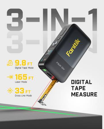 3-in-1 Precision Measuring: The Fanttik A10 Apex combines a digital tape, laser measurer, and green cross-line laser in one device. The 9.8ft digital tape offers millimeter-level accuracy, the 165ft laser measures long distances, and the 32ft green cross-line laser provides precise leveling and alignment. Perfect for renovation, crafting, and gardening, it doubles your productivity