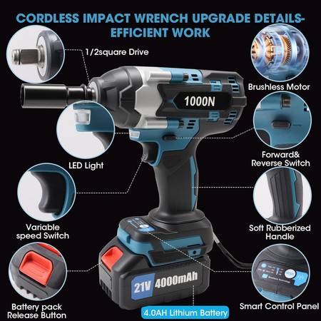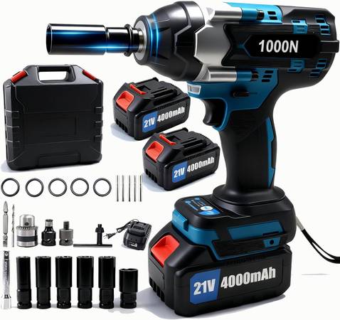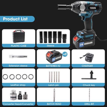 【Accessories】This product includes a 1000N*M impact wrench, two 4000mAh batteries, a fast-charging socket, an extension rod, six sockets (14mm, 17mm, 18mm, 19mm, 21mm, and 22mm), an adapter, a drill chuck, and a rubber ring. Drill bits, screwdriver bits, chuck keys, latches