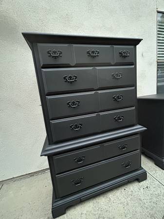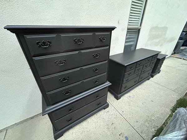 Instead of spending 1300 at Costco for a single small 5 drawer laminate non wood dresser get a solid cherrywood American Drew bedroom set pristine condition with thick solid brass handles for less and can deliver local if needed.Tallboy is 56 tall by 39 wide by 20 deep.Longboy is 56.5 long by 20 deep and 33.5 tall.Nightstand is 22.5 wide by 15.5 deep and 25 tall.All drawer work great and looks stunning.If the ad is up we have it professionally wrapped in Mission Viejo for 1275 firm don’t lowball yourself out it’s a one and done great find .New pro liners also .We will reply in order to those who leave call back numbers.