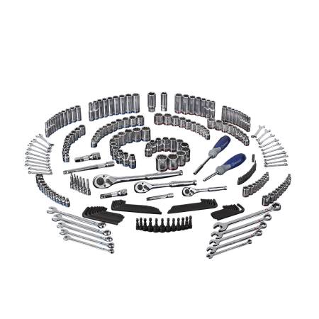 250-piece mechanic tool set includes 2 drive tools, 4 extensions, 134 sockets, 3 quick-release ratchets, spinner handle and 30 wrenches