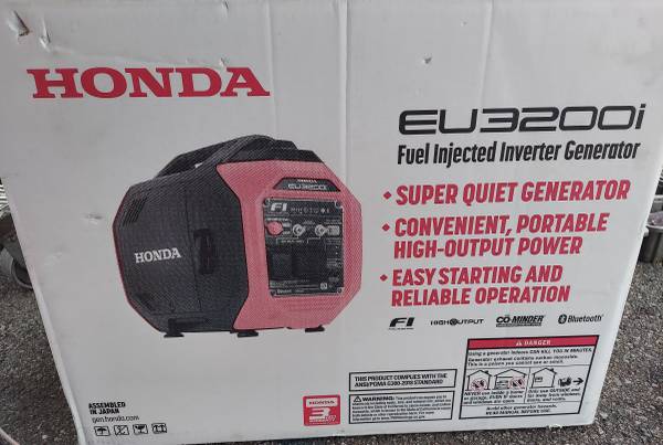 New Honda EU3200i Inverter Generator Single Fuel (Gasoline). 3200 max watts of reliable power runs most 13,500 BTU RV AC units. Weights only 59.1 lbs. Portable and packable with integrated upper and lower handles. Superior power, performance and quality. Come see it anytime. Price firm. Check out my other postings!