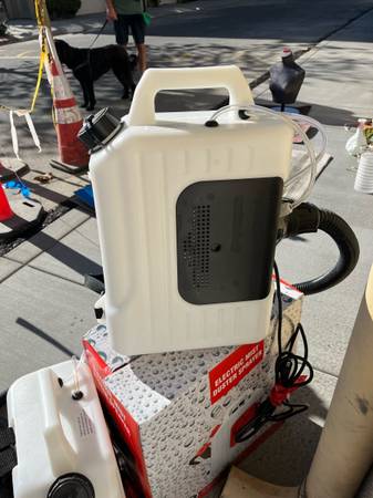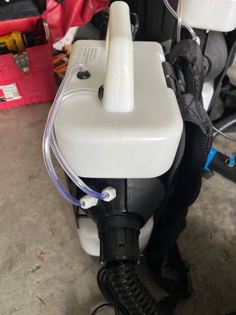 Backpack design with adjustable straps, long flexible hose, and handheld wand. Plug-in 110V power. Great for disinfecting, pest control, odor treatment, landscaping, barns, garages, shops, or large indoor/outdoor areas.