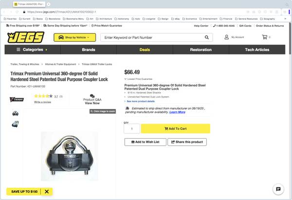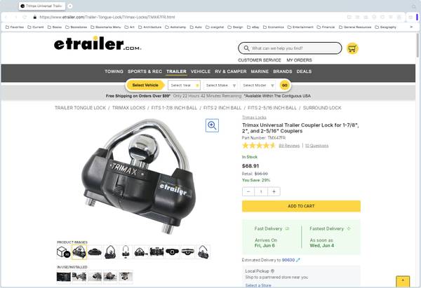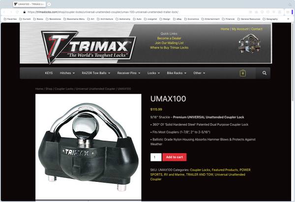 Trimax Trailer Lock – UMAX100 Good shape – not much use. Action very smooth and easy – works as good as new. $40.00 firm. That’s less than one half the lowest delivered online price.