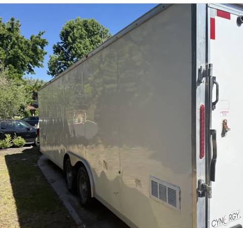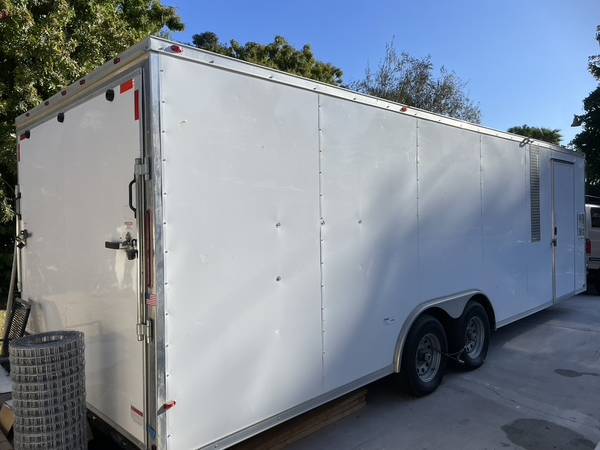 OFFICE? HAULER? STORAGE? TOY BOX? IT IS YOURS TO IMAGINE! 5200 PER AXLE - PLUG AND PLAY W/A POWER BANK (see photos) Just a flip of the switch and you have light! GOOD CONDITION! MUST SELL! SIDEWALLS ARE 7 FEET, TOWABLE BY MOST STANDARD SUV'S, DRIVE UP RAMP, SIDE DOOR, DOUBLE AXLE, 15" WHEELS, STANDARD BUMPER PULL, BALL HITCH, 3 FLAT PANEL LED LIGHTS COMLETELY LIGHT IT UP WITH TOGGLE WALL SWITCH, DIAMOND PLATE V NOSE, STEEL FRAME, ALUMINUM SKIN, ROOFED AIR VENTILATION (CAN BE REMOVED). VERY LITTLE MILAGE ON IT B/C IT WAS USED AS ON SITE OFFICE. BASED IN SOUTHERN CALIFORNIA SO MINIMAL RUST, SPARE TIRE AND GOOD TREAD ON TIRES. THIS IS READY TO TOW OR A GREAT BLANK SLATE FOR AN OFFICE OR HAULER WITH SLEEPING QUARTERS. MUST SELL
