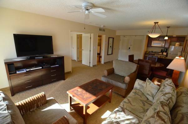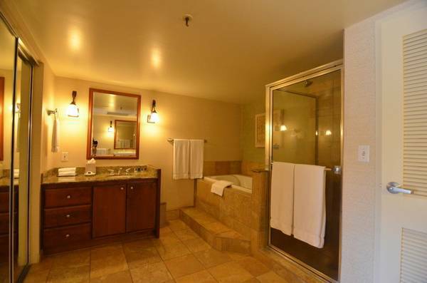 Master bedrooms is large and includes a king-sized bed, flat screen TV, dresser, large closet, and a floor to ceiling window that opens to your private lanai. Master bedroom has a large bathroom with his and her sinks, water closet, an oversized tub, and a separate shower.