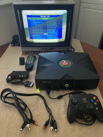 Original Xbox modded with an Xecuter X2.3B Pro running EvolutionX on a 160GB HD. The console is in good condition, boots into EvoX, and works great. The DVD drive works too. When the Xecuter is disabled, a service screen and flashing red ring display.