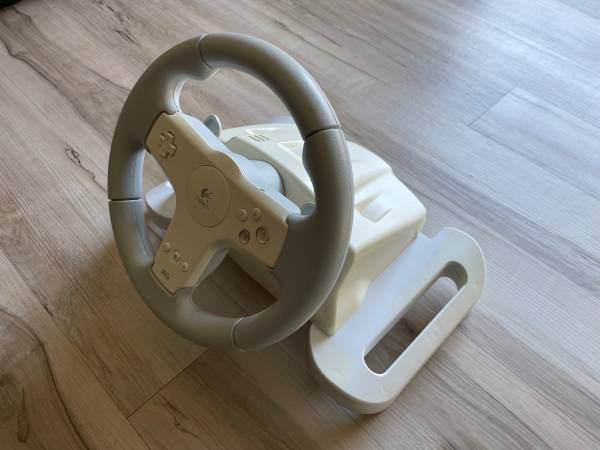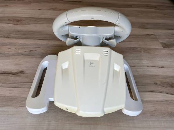 Official Nintendo Wii Logitech Steering Wheel connects with Bluetooth dongle (included). Missing power adapter but can be easily replaced (search Amazon). Great condition, just yellow tint from aged white plastic. Gas and brakes are controlled with hand paddles on each side. Works with the following games (also works on modded Wiis with backups from hard drive):