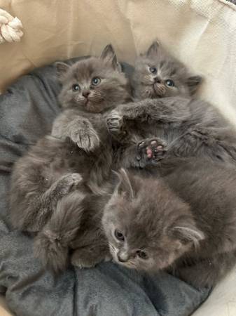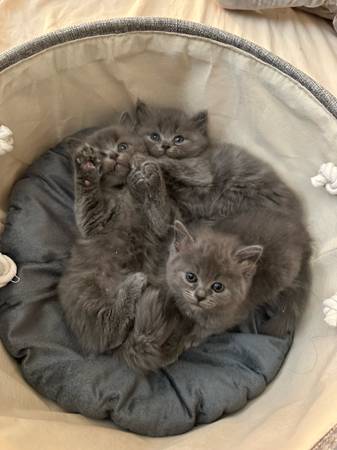 I have seven rare and beautiful British Longhair kittens ready to find their forever homes soon. There are three grey (two boys and one girl), three brown (two girls and one boy), and one white with grey spots (a boy).