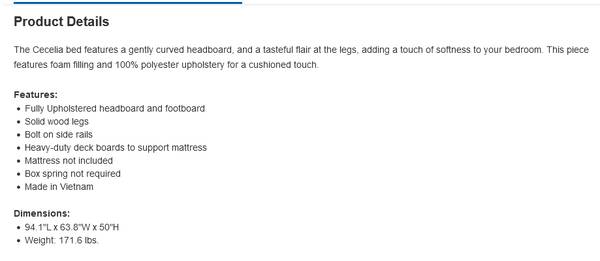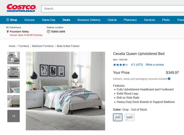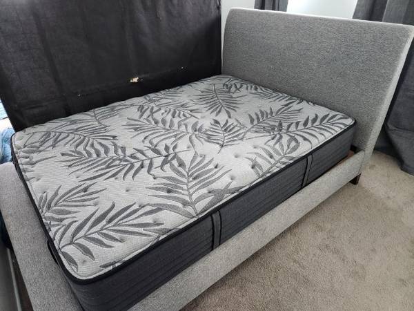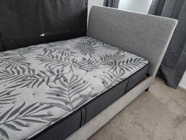 CECELIA UPHOLSTERED QUEEN BED NEW FROM COSTCO. NO MATTRESS. JUST THE BED. I HAVE 2 OF THEM $350 EACH. I WAS GOING TO USE IT IN A DUPLEX I HAVE IN NEWPORT BUT PUT IN A CAL KING INSTEAD. I USED TO BUY TRUCKLOADS OF COSTCO DISCONTINUED AND RETURNED ITEMS AND NOW I'M CLEANING OUT MY WAREHOUSE. I DO HAVE A NEW Novaform 14" QUEEN Serafina Pearl Gel Memory Foam Mattress FOR $749