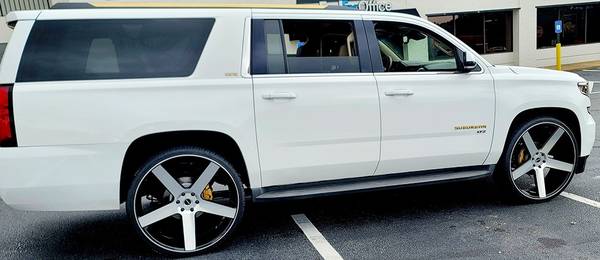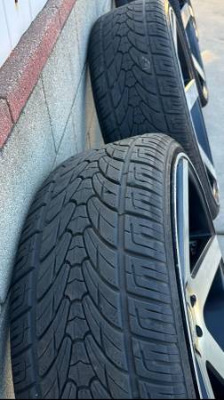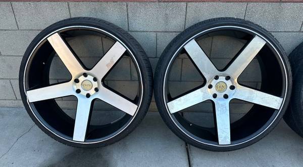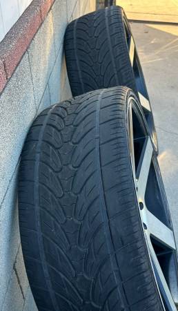28" Perfetto Black Machine Rims with tires 6 lug 2 good tires and the other 2 need to be replaced. Willing to trade for other rims looking to change the look of the truck. Will fit Escalade, Denali, Yukon, Tahoe, Suburban,Silverado, Sierra