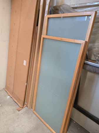 Free hanging Display panels, with about 40' of railing, and hardware. Panels sizes are as follows Glass panel 30" wide x 75" high and 30" wide x 63" high Fabric panels 48 x 84 48 x 75 48 x 72